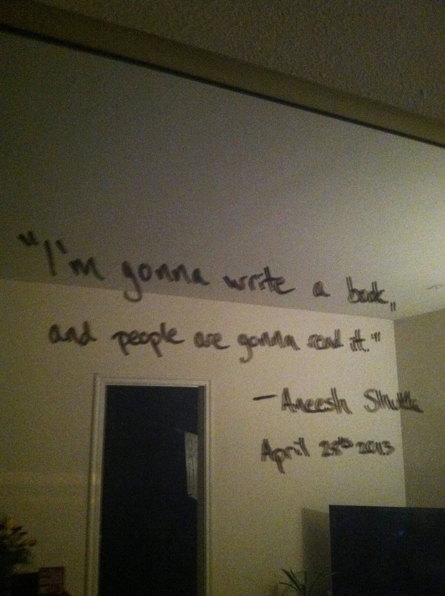The image above is something I wrote on the mirror of my living room coat closet in my apartment in college. I distinctly remember coming out of my room, storming over to the mirror and attacking it with an Expo marker and then storming back into my room, slamming the door, leaving my two roommates in a dazed confusion.